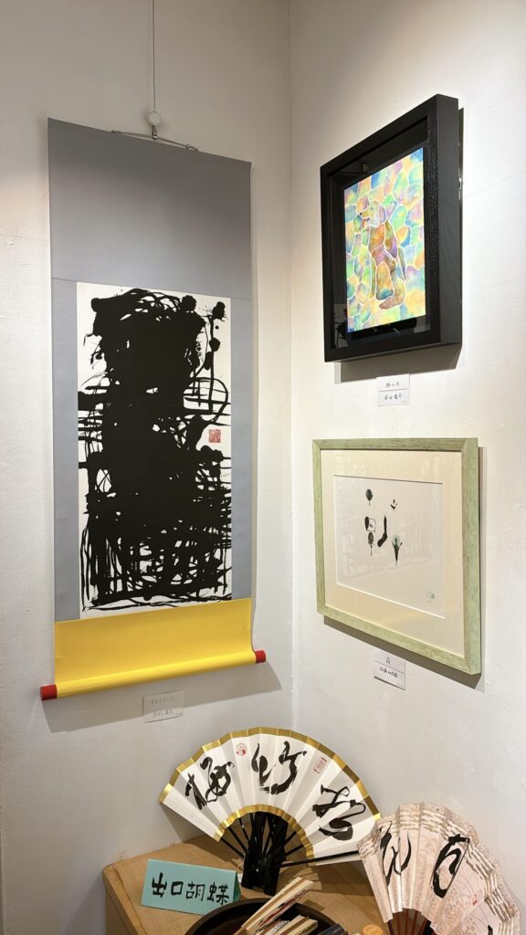 グレー×黄色の掛け軸が私の作品です。タイトルは「オカメインコ」です。